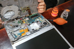購入から3年を過ぎていたこともあり、また現場でパソコンを開くことも多いので、パソコン内の埃が怪しいかなと思い、思い切ってパソコンを開いてみました。ぱっと見では、さほどではなかったのですが、ブラシで全体の埃を落とし、ブロワで飛ばしてみたところ、ファンからは何度やっても埃が出てきました。